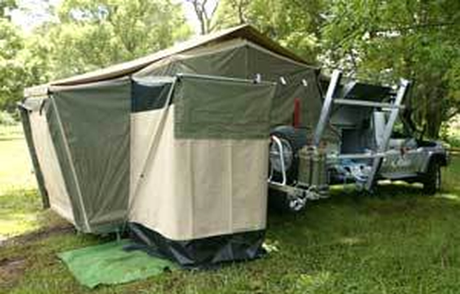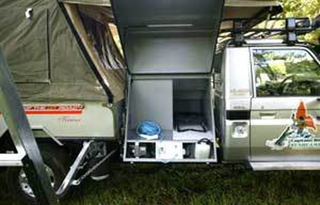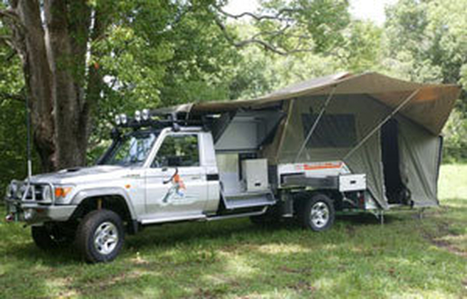 New to the Australian bush the Cape York Bush Kamper is a quite unique combination of big muscled, go-anywhere vehicle, caravan and tent. Based on the reliable 70 series Toyota Landcruiser with an inter-cooled Turbo Diesel V8, factory front and rear diff lockers, ball bar and winch, off road suspension, UHF radio, long range fuel tanks, which Toyota claims delivers a massive 430Nm of earth-shaking torque, this is a very serious off-road vehicle. The extended chassis is fitted with a customised Kimberley Kamper body with an added Gullwing storage pack.