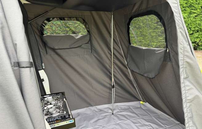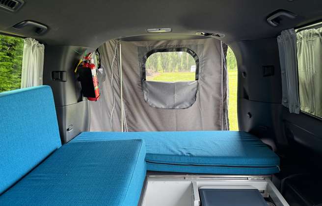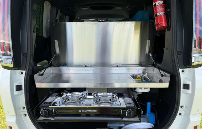 Inside, you’ll find a spacious double bed, LED lighting, convenient under-seat storage, reversing camera and everything you need for cooking on the road: a 2-burner gas stove, butane canisters, pots, pans, utensils, crockery, french press, and more. A 18L 12v fridge box is powered by an auxiliary battery that recharges as you drive, and even better, the solar panel charges both the house and vehicle battery, helping keep your setup powered for longer, wherever you roam.